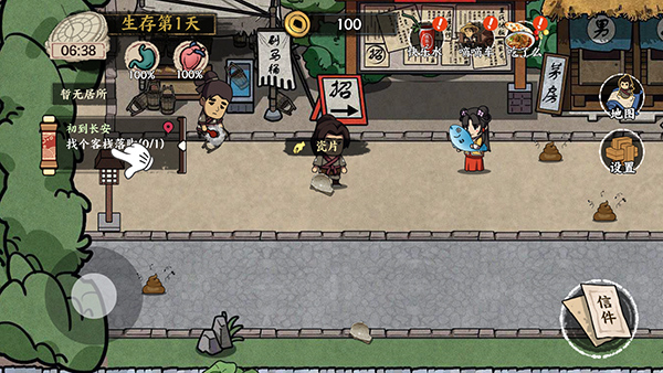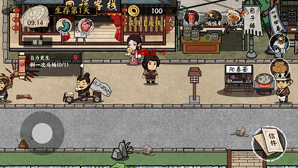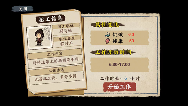 1、首先进入游戏依然是我们比较熟悉的新手教程,大家千万不要怕麻烦选择跳过,完成新手任务我们可以获得少量的金钱,虽然不多,但是可以足够我们前期在唐朝生活一周是没有问题的,前期的赚钱工作和打工模拟器一样,种类比较少,而且大多是你叫浪费时间的体力活,刷马桶的工作我是不太建议大家去做的,会很大程度上降低我们的健康值,健康值过少的话还要花费金钱去看病,得不偿失。