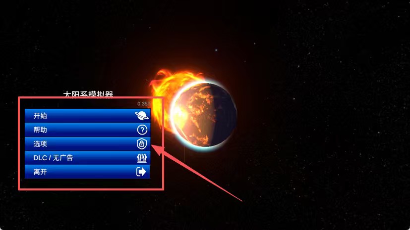 1、游戏主界面,点蓝色菜单栏里带火焰图标开始选项,开启太阳系模拟之旅。