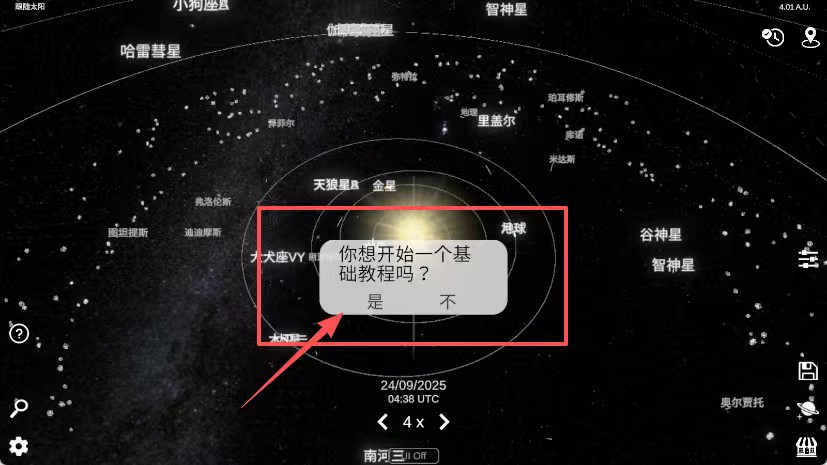 3、星图界面弹出教程提示框,点是或不按钮选择是否开始基础操作教程。