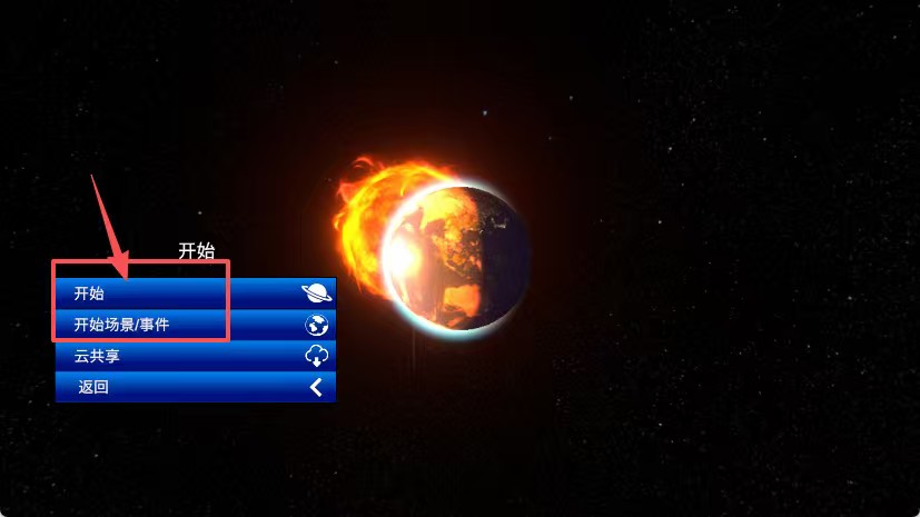 2、地球燃烧特效场景,点左侧菜单栏红色标注开始场景事件按钮,进入特殊场景模式。