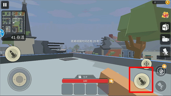4、选择好降落地点后,会进行降落,到达地面后要注意,周边是有很多敌人的,红色方框内的按钮是射击。