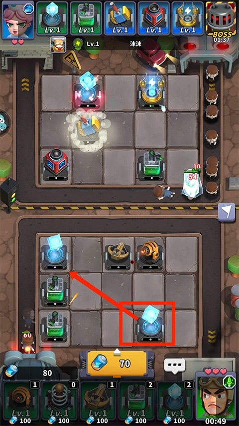 6、将两个相同类型的炮塔进行拖动合成,可以升级成更厉害的炮塔,拥有更高的伤害和更快的射速,从而更快的将僵尸消灭,
