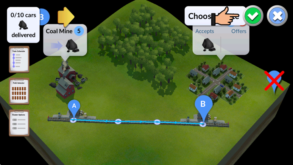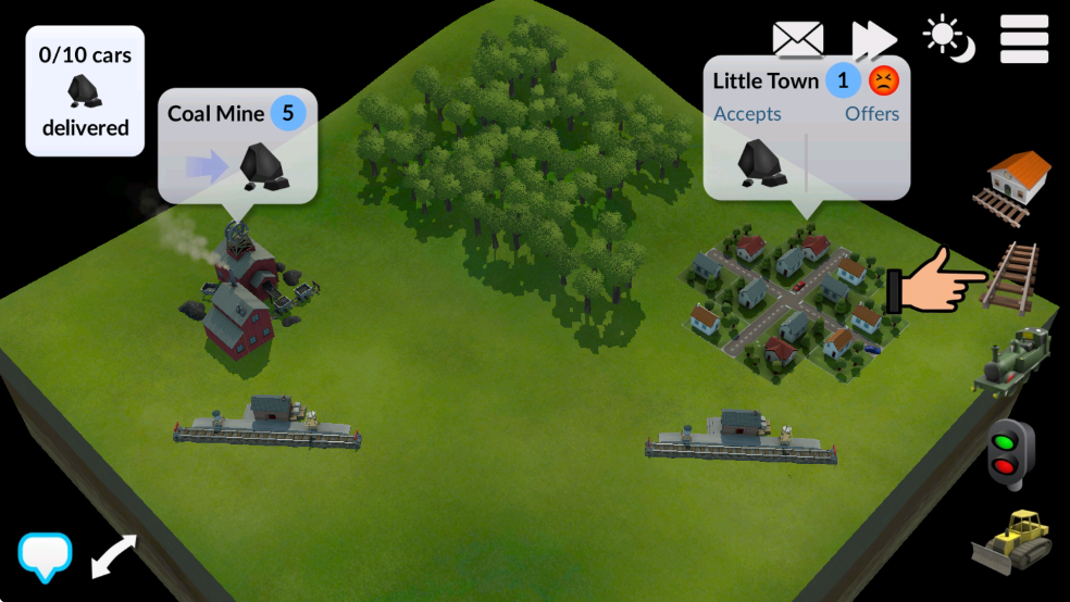 4、让我们先在煤矿站和小镇站之间铺设一条铁路轨道。要建造新轨道,请选择屏幕右侧的轨道图标。然后在两个车站之间绘制轨道。