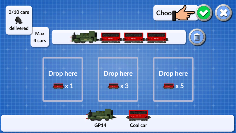 7、路设置完毕后,可以创建一列新火车了,要为火车添加煤车,请将煤车拖拽到其中一个下拉框中,至少添加一节煤车后,点击确定按钮。