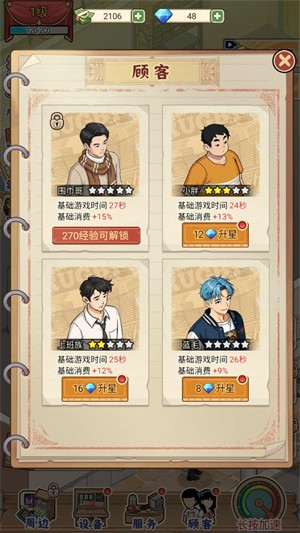 4、点顾客按钮能查看已解锁角色,用钻石升星可提高收益。