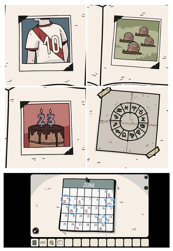 打开笔记本观察四张照片(注意数字和数量),再到二楼第一房间门口结合日历获得四个「符号」。