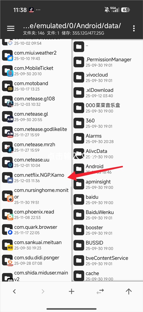 2、在列表中即可看到荒野大镖客救赎手机版的游戏目录,一般名称为com.netflix.NGP.Kamo,进入该文件夹后,继续打开Files目录。