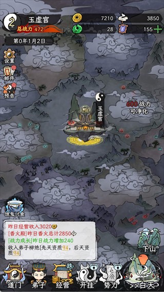 当总战力达到升级要求时,立即升级道门,升级后不仅会解锁更多弟子,还能开放炼器、织造等功能。同时,道门的升级能够提升每日进香人数和收入,是宗门扩张的关键。