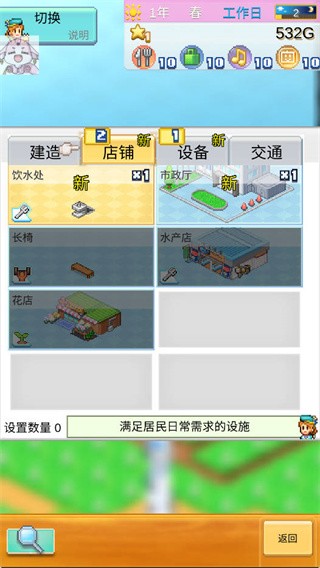 3、市政厅刚刚开始的时候和其他东西都没有相性,可以暂时把它建在角落里,之后可以再移动;市政厅共有四个选项,按照从上到下,从左到右依次是扩地、设施、居民、措施