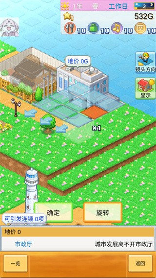 2、接下来可以开发任意几块土地,点击土地可以查地价、舒适度等信息,其中地价可以通过周围的建筑相性得到提升,但是注意不是所有的建筑都和土地有相性