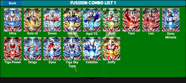 3、点击右上角fussion list可以查看欧布奥特曼不同形态的合成方式;