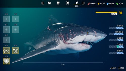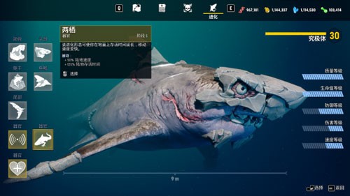 在《食人鲨》中,鲨鱼的终极成长并非单一数值提升,而是通过进化形态系统实现能力分化。目前游戏共设有三大进化路线,分别为:暗影系、骨质系、生物电系,每种形态均对应不同的战斗风格与玩法取向。