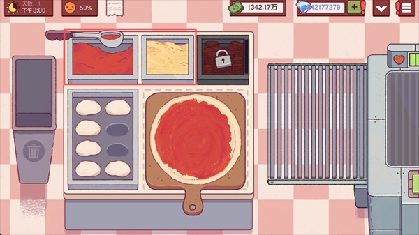 ②添加原料:标准披萨的两大基本原料是酱料和芝士,点击酱料,均匀地涂抹在面团上,记得控制好酱料的量,避免浪费或涂得过多;同样,芝士的量也要适中,既保证口感,又不超出成本。