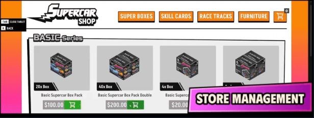 4、按照自己喜欢的方式设计超级汽车商店。解锁超级跑车系列,订 购惊喜盒子,上架开始销售。为收藏家打造完美的商店。