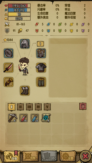 8、到了存档点之后把背包里的金装普通装都卖掉,还有附魔材料也卖掉,现阶段我们用不上附魔。有用的装备穿上,带有额外经验的装备换了(10级需要759的经验,额外经验加成较少不值得了)买上一瓶小红和一瓶小蓝,然后走人,如图所示