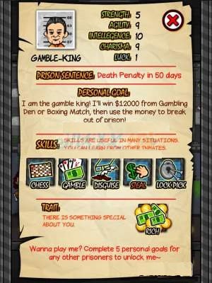8、三叔,赌博盗窃样样精通,想要来钱快就需要找他,同时在游戏中还贩卖东西,绝对是监狱老手,新手玩家选择这个角色可能一下代入不了不建议新手使用。