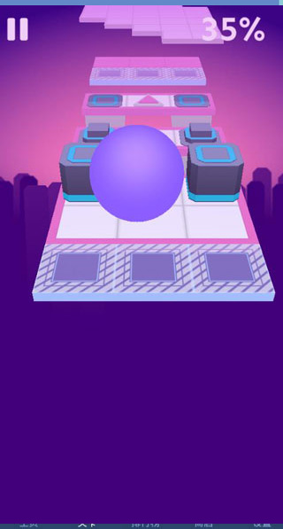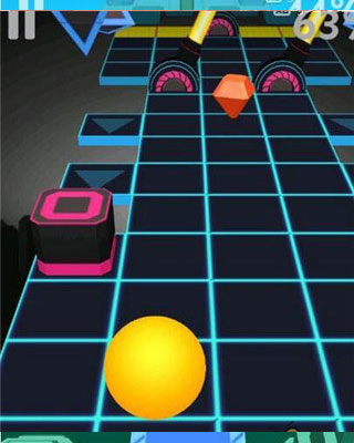 期间无需上滑使球跳起,方向最重要,会自动跃过方块,只需操纵落点方位,遇到红色图案的钻石,滚到所在位置吃掉,一路沿着缝隙处穿滑而过即可。