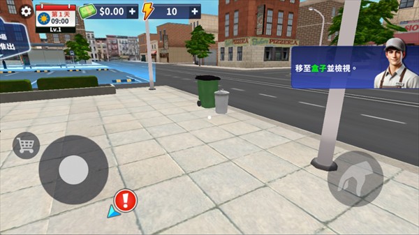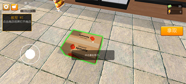 购买物资后,快递小哥会放到店铺门口,靠近物资箱时,将圆点对准箱子,会出现交互按钮,点击即可拿起物品。