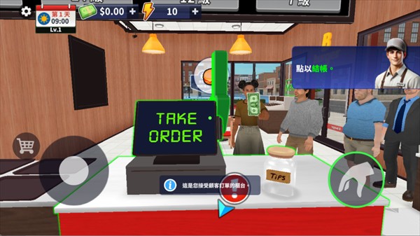 开店后,前往点单台接收顾客订单并收款。