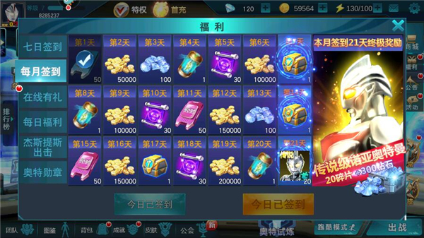 2、如下图,玩家可以通过七日签到、每月签到、在线有礼等来获取钻石。