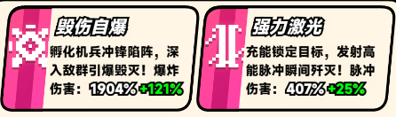 主技能1:毁伤自爆、主技能2:强力激光