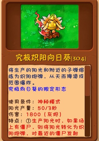 核心能力:每3秒生产50阳光,若场上有僵尸则将阳光转化为炽阳炮弹,对最近的僵尸造成1800点灰烬伤害,是究极向日葵的限定形态。