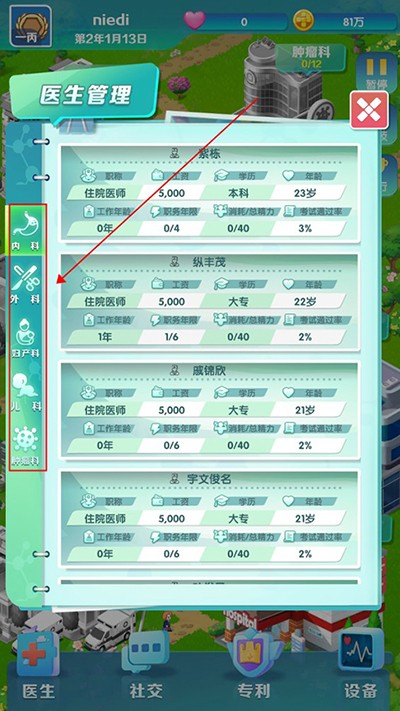 1、游戏内有着内科、外壳、妇产科、儿科、肿瘤科五种医生类型,玩家可以对每种科室的医生进行招聘,增加医院人手;