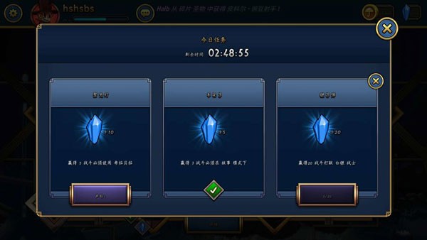 1、任务:在游戏的大厅页面点击任务可以查看每日任务,这里每天会为大家派出三个任务,完成任务后可以领取到相应的宝石奖励。