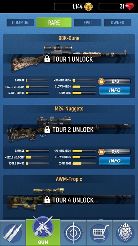 狩猎狙击手中文版是一款荒野狩猎题材的射击类手游。在游戏中你将成为一位猎人,你要使用枪支射杀动物,获得尸体进行售卖。售卖的价格会根据动物尸体好坏浮动,获得金币后能购买更多地枪支,增加狙击射击体验。还能和其他玩家比拼射击技巧,看看谁是真正的狩猎王者。喜欢狩猎游戏的玩家快来下载游玩吧!