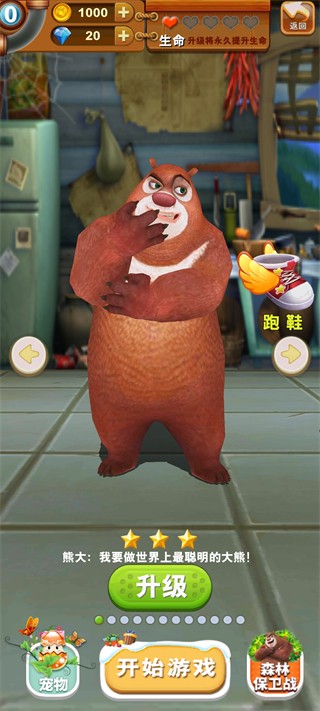 进入无尽模式后,你可以提升熊大的各项属性,例如生命值等,让他在跑酷过程中更加耐打。同时,还能解锁跑鞋等增强跑酷能力的道具,提升游戏体验。此外,还可以切换其他皮肤,享受不同的视觉效果。
