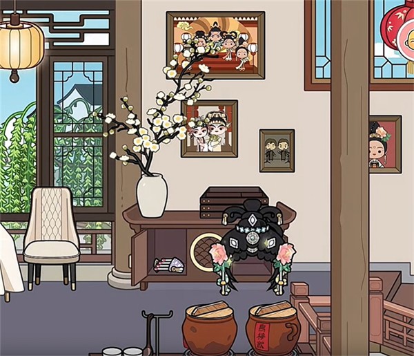 5、戏台一侧的柜子下方,右边的礼物盒中藏有一顶假发,旁边还放着饰品。