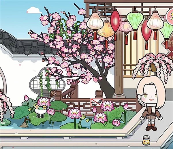 8、沿着曲桥前行,可以看到荷花、青蛙、桃花树,以及悬挂在江南民居屋檐下的古风灯笼,细节满满。