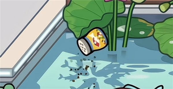 5、曲桥旁的鱼食可以用来喂鱼,池塘里的鱼儿会聚过来抢食。