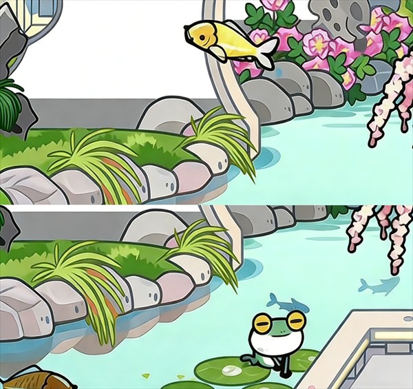 4、池塘中的鲤鱼会跃出水面,青蛙也会在荷叶间跳跃,场景非常生动。