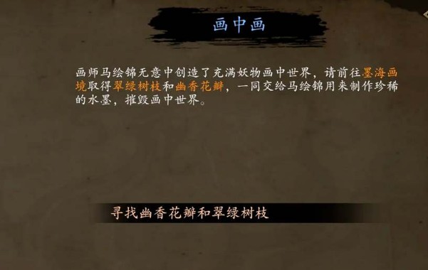 此外,画中画任务有着明确的要求,那就是需要玩家前往墨海花境去寻找翠绿树枝和幽香花瓣。其中,翠绿树枝玩家只要跟着主线的进程走,便能够顺利找到。然而,幽香花瓣则需要玩家自行去探寻并挑战 boss 才能获得。