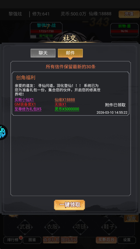 4、点击邮件,游戏还为新手玩家准备了创角福利;