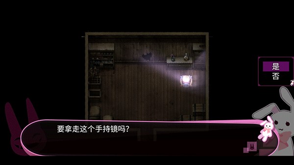 6、根据剧情喵露朵露薇会醒来,按照图中所示先到桌子面前发现玩偶不见,之后查看右边的镜子。最后从门这里出去