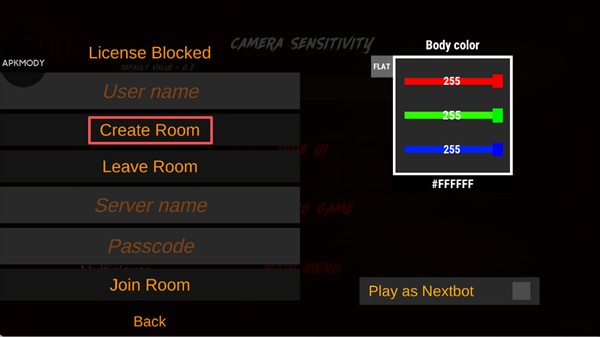 你的好友可以通过点击 Join Room 输入房间信息加入,此外,还可以调整身体颜色,勾选 Play as Nextbot 来选择扮演Nextbot角色。