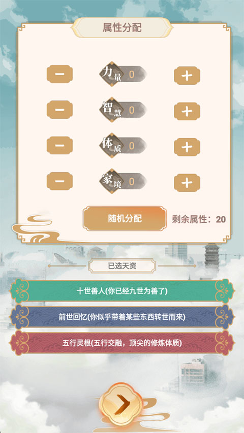 1、进入都市修仙模拟器游戏内,我们选择三个天赋来助力我们成长。