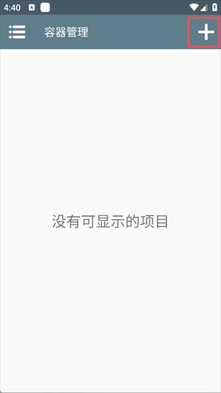 1、打开攀攀爬动物手机版,点击右上角+号创建容器。