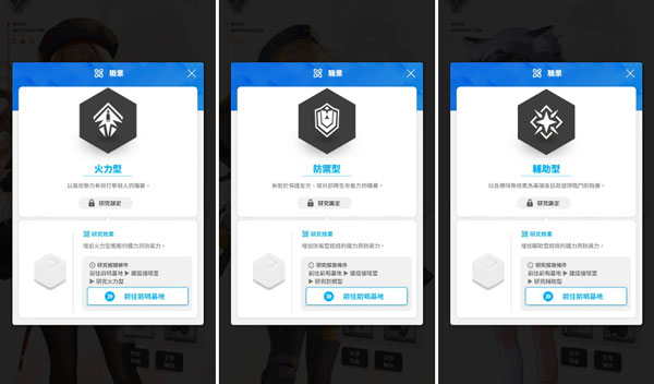 妮姬主要分为火力型、防御型、辅助型3种职业,每个角色还有不同的武器、晶片代码属性和阶段I~III 的爆裂技能。