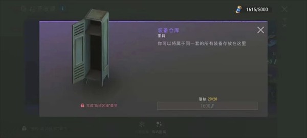 装备仓库可以通过“起源收藏·海岛区域”页面获得,这需要用到高额的感染者基因组来兑换。兑换后,你将获得全新的家具——装备仓库,并可以在基地中使用。