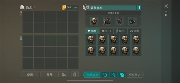 装备仓库内只能存放同一类型的套装,每个仓库最多能存放10套相同的装备。这样,你可以将一整套的衣服(例如防护服、战斗装等)统一管理,并且每套装备会被标注套装名称,便于查看和识别。