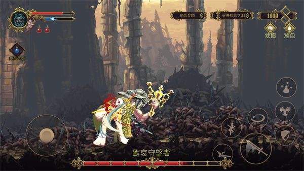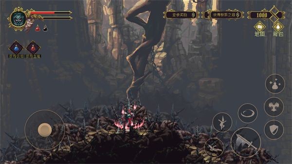 6、跟随指引往前走,玩家可以遇到第一个“篝火”,游戏玩法类似魂游,有血瓶、坐火等设定,在这里你可以恢复自己的状态以及血瓶数量,但是小型敌人也会复活。