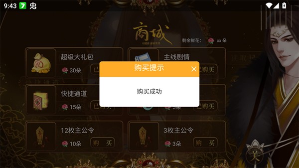 3、然后我们可以打开游戏里的鲜花商城功能,你拥有无限的鲜花可以使用,因此可以直接购买所有的商品。
