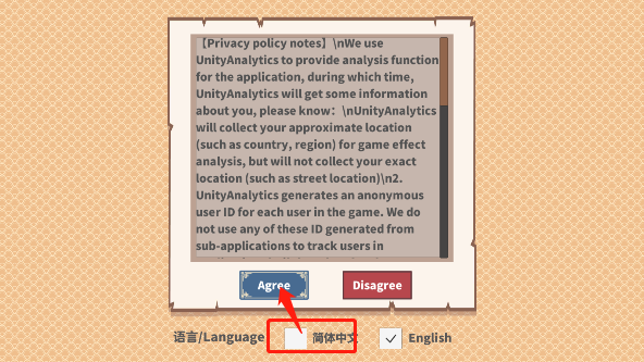 进入游戏默认显示为英文,我们需要选择勾选到简体中文然后点击“agree”