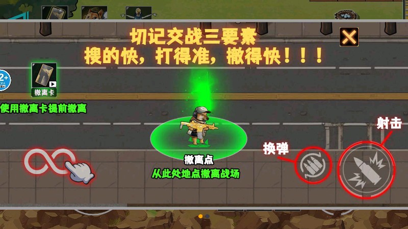 1、打开游戏,首先是游戏的操作介绍,玩家需要滑动左下角的摇杆控制角色左右上下移动,右侧的按键则是换弹,以及射击