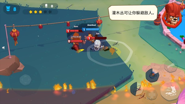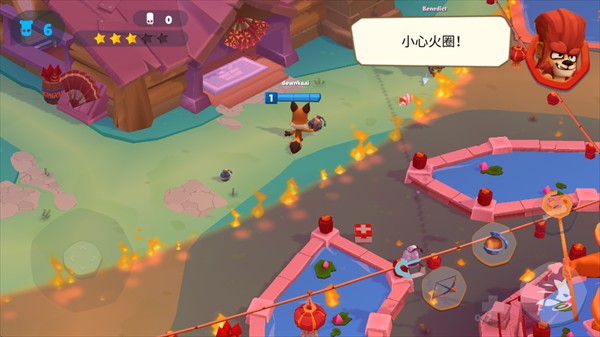 类似大逃杀的缩圈玩法,触碰到火圈会持续掉血,只能不断往圈中心方向移动。