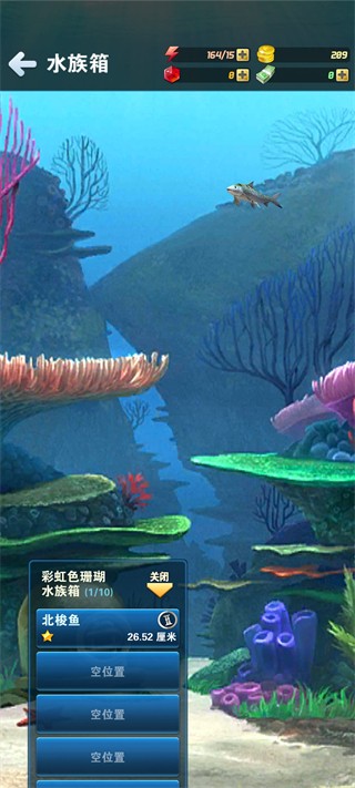 6、将鱼放入水族箱后可进行展示,同时还能逐步解锁更多水族箱位置,收集并保存不同种类的珍稀鱼类。