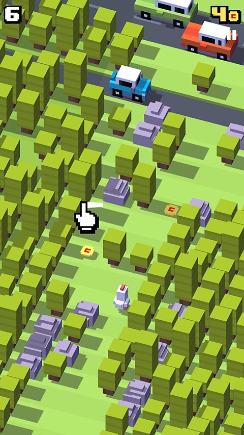1、这游戏没啥关卡,就是一条道走到黑的无尽模式。你要做的就是帮小家伙穿马路,躲车。手指在屏幕上上下左右划,角色就跟着往哪儿跳。分数只跟你往前走了多少步有关,往左右平移不加分,往后退也不扣分。